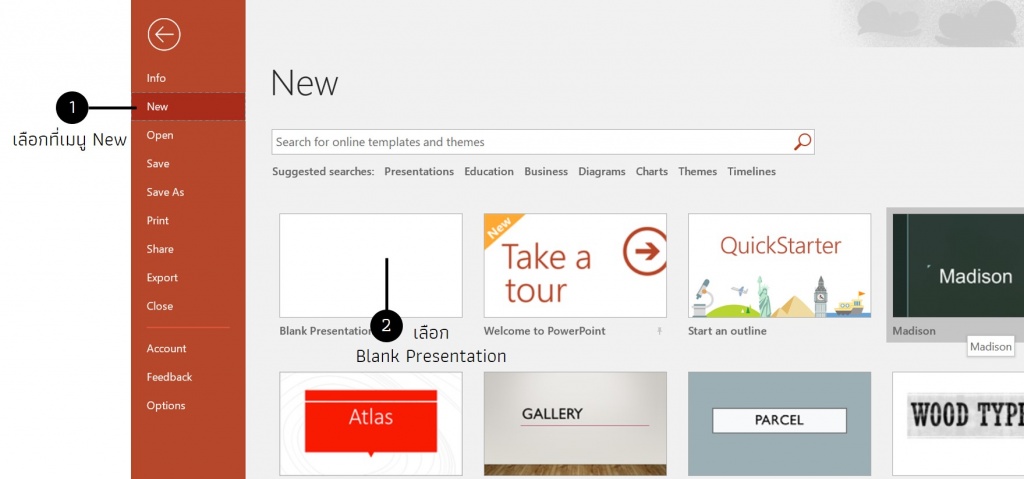 2. เลือกไปที่ New ที่เมนูด้านซ้ายของหน้าต่าง จากนั้นกดเลือก  Blank Presentation