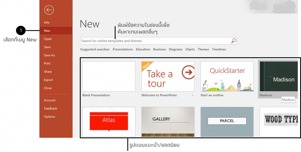 2. เลือกไปที่ New ที่เมนูด้านซ้าย  โปรแกรมจะแสดงรูปแบบแนะนำหรือยอดนิยม  หรือสามารถพิมพ์ในช่องค้นหาเพื่อรูปแบบเทมเพลตอื่นๆ ได้