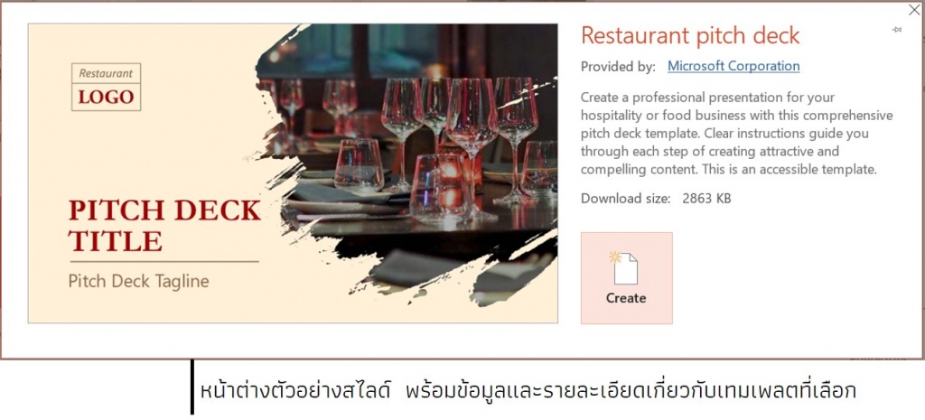 4. การแสดงตัวอย่างจะปรากฎพร้อมกับข้อมูลและรายละเอียดเกี่ยวกับเทมเพลตที่เลือก